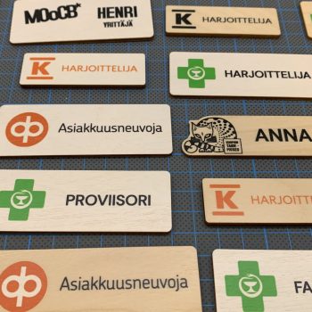 Hintaesimerkki: Tulostetun vanerisen nimikyltin hintahaarukka liikkuu sarjoina tilattaessa 7,00 – 18,00€ välillä / kpl (alv. 0%). Hintaan vaikuttaa: